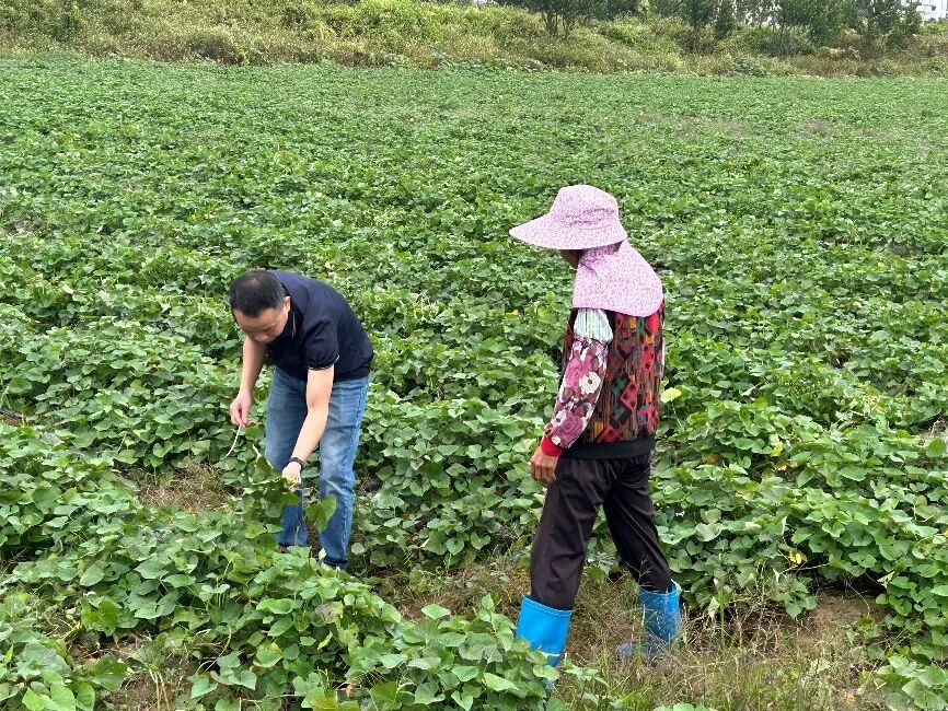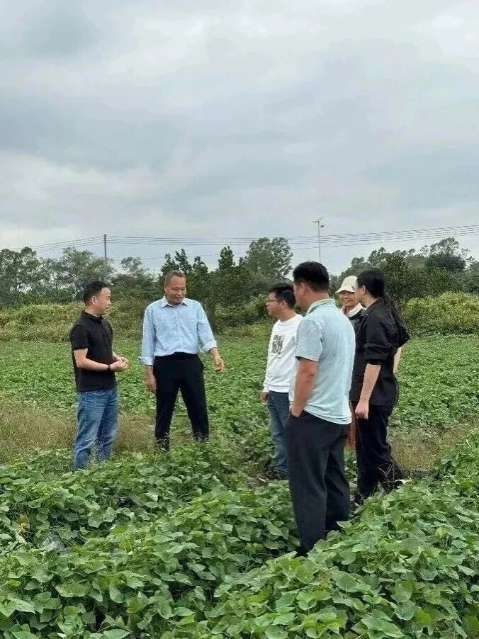 仪式结束后,科技特派员团队马上走进田间,对示范基地当前的苗情、田块布局及土壤状况进行了查看。团队重点关注生物有机肥的施用效果、栽培规范的落实情况以及土传病害防控等技术要点,并根据现场观察向合作社提出了可操作的管理建议。当日下午,团队前往丽岗镇政府与镇政府及驻镇帮扶单位代表召开联席会议,就示范基地建设目标、技术路线和来年甘薯绿色种植推广计划进行了交流与对接。