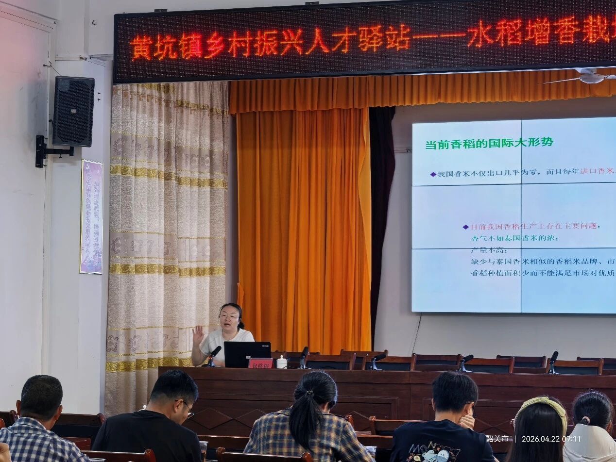 2026年4月21—22日,仲恺农业工程学院农村科技特派员包格根博士带领研究生徐一宁、陶芳莹,赴韶关市南雄市黄坑镇,依托镇乡村振兴人才驿站开展专项助农服务活动,通过专题培训、田间实操指导相结合的方式,为当地水稻产业提质增效注入科技动能,黄坑镇党委副书记、驻镇帮扶队队长周海兵、黄坑镇党政办组织干事叶凡全程参与相关活动。