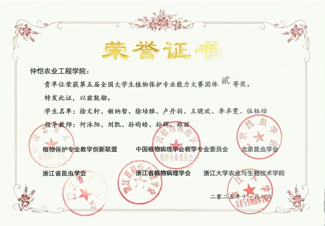 11月7日-9日,农业与生物学院何沐阳、刘凯、孙昀皓、邵明伟、韩群鑫、郑丽等教师带队学生参加第五届全国大学生植物保护专业能力大赛并取得了优异的成绩,荣获团体二等奖等多项荣誉。