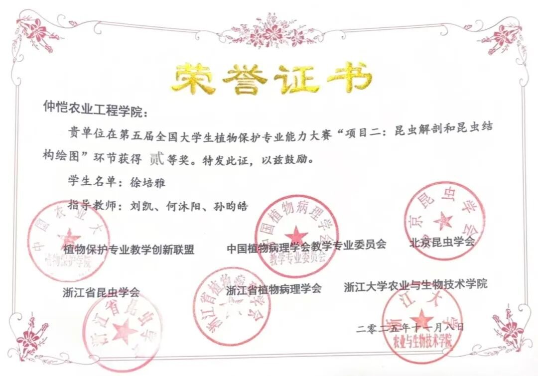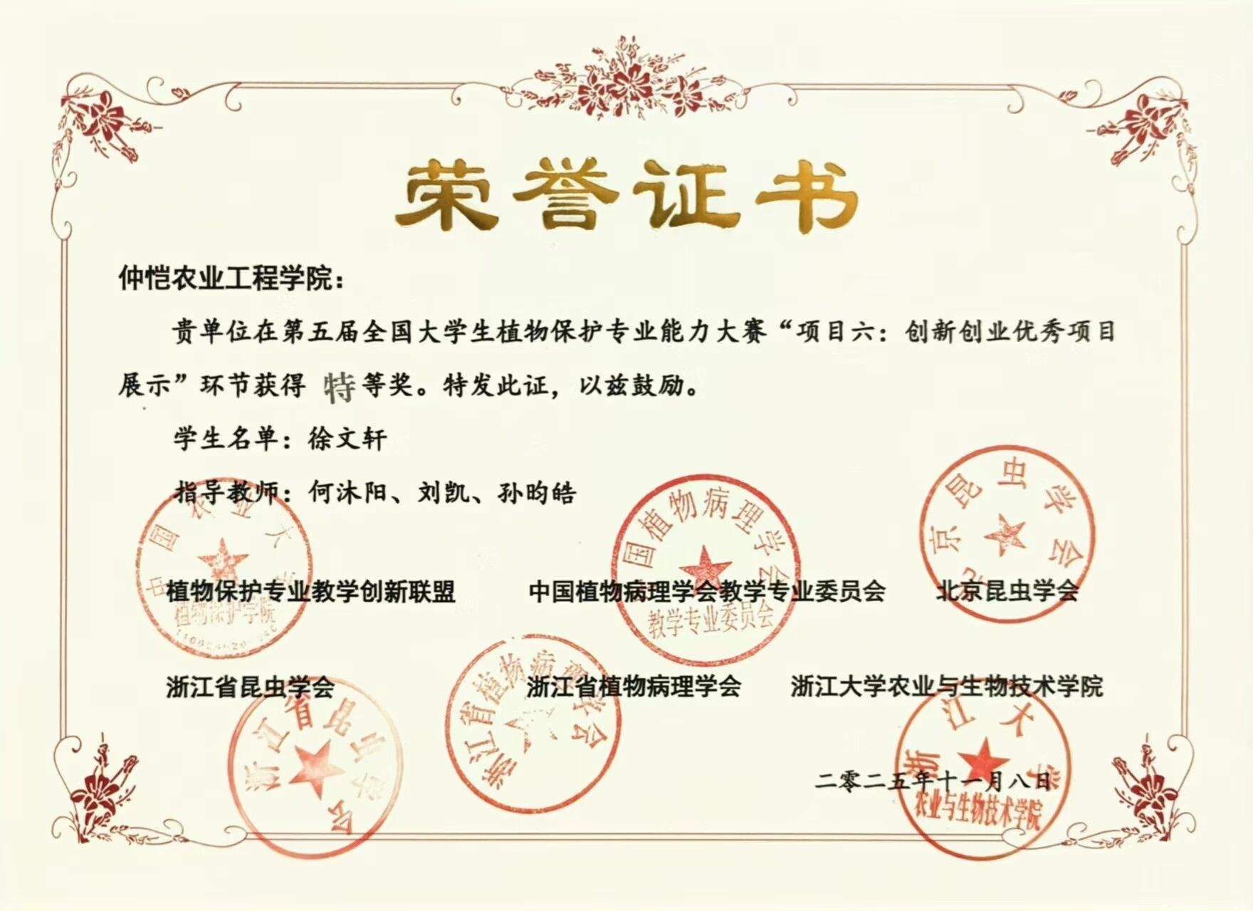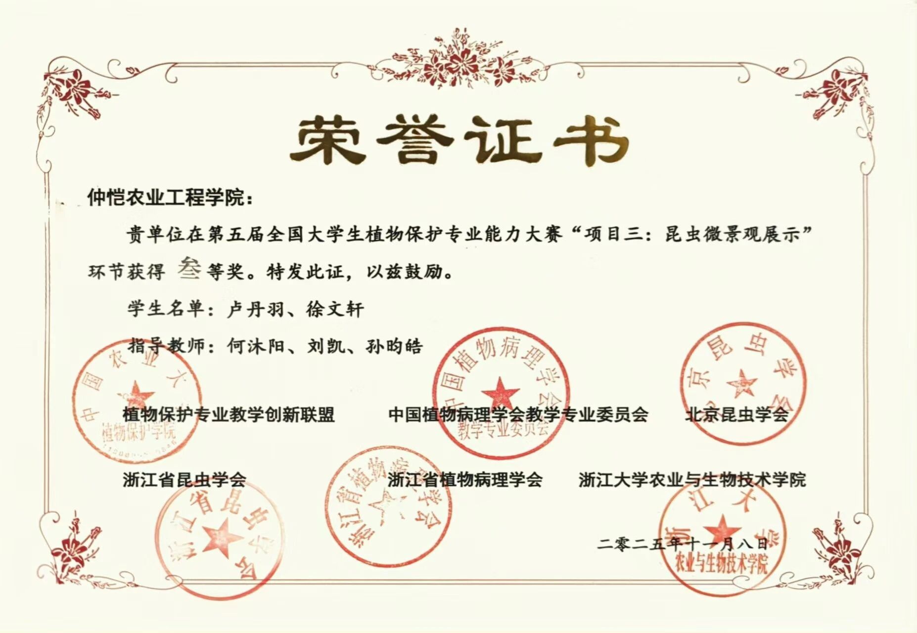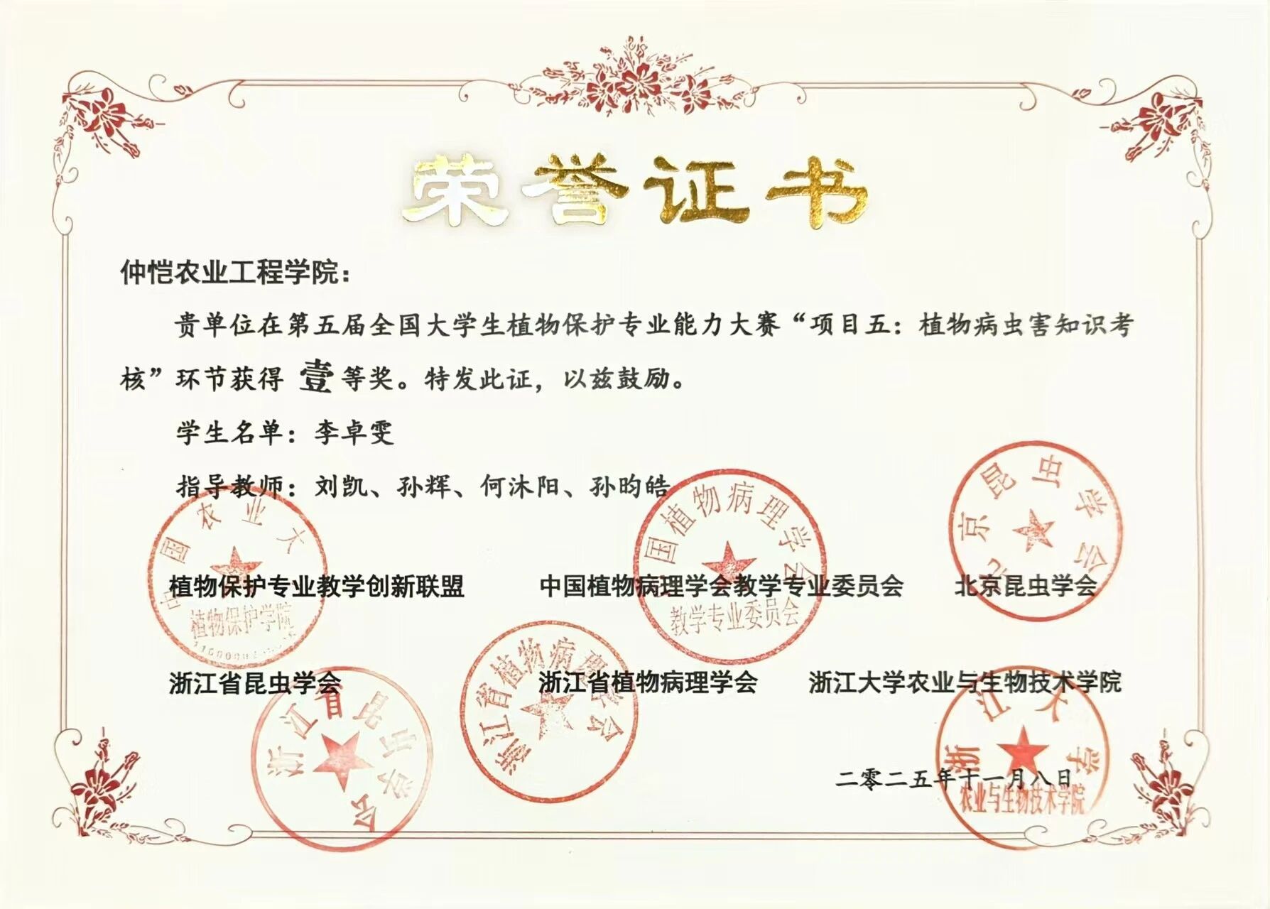 李卓雯获得“项目五:植物病虫害知识考核”环节的一等奖(指导老师:刘凯、孙辉、何沐阳、孙昀皓)。