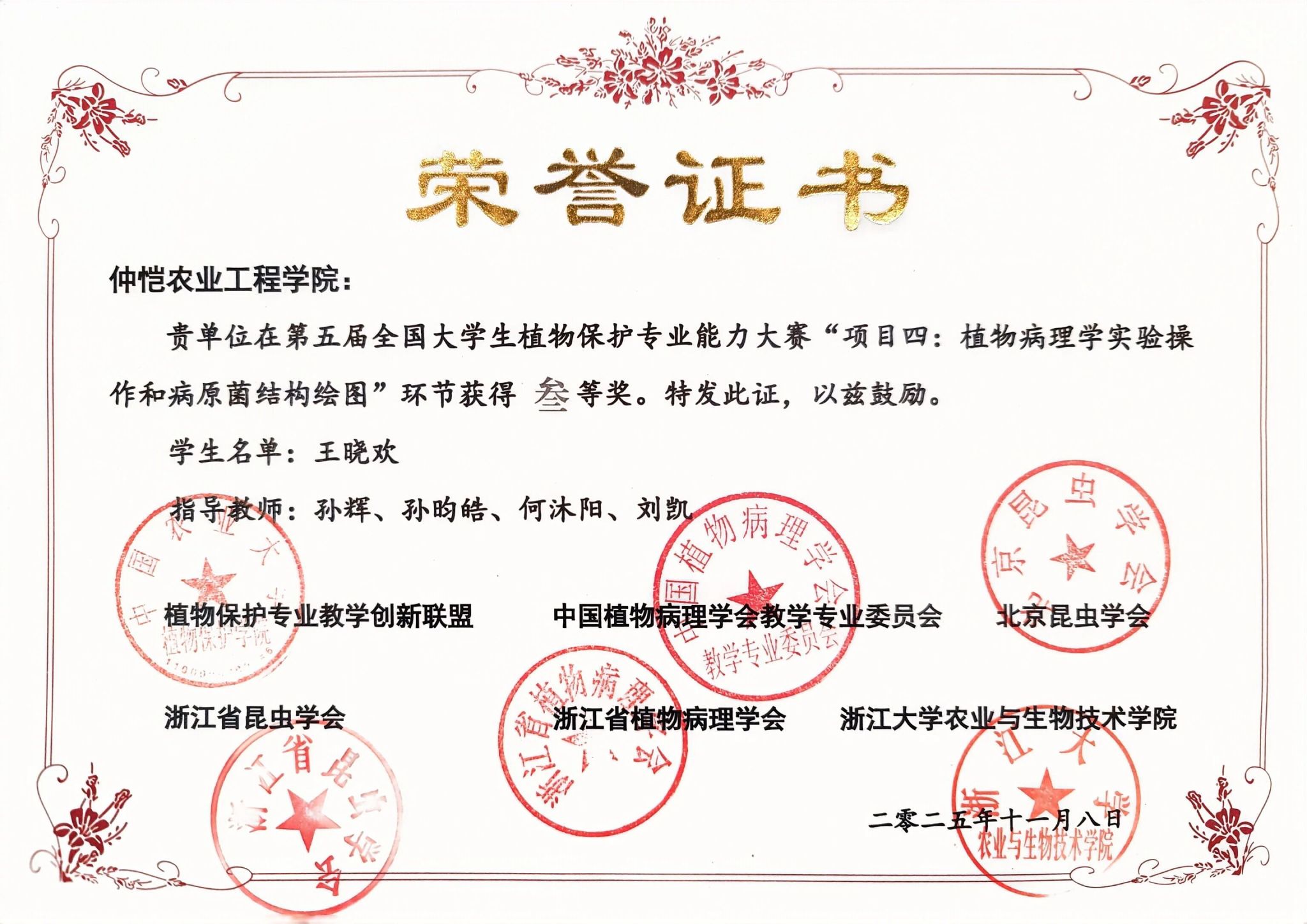 王晓欢获得“项目四:植物病理学实验操作和病原菌结构绘图”环节的三等奖(指导老师:孙辉、孙昀皓、何沐阳、刘凯)。