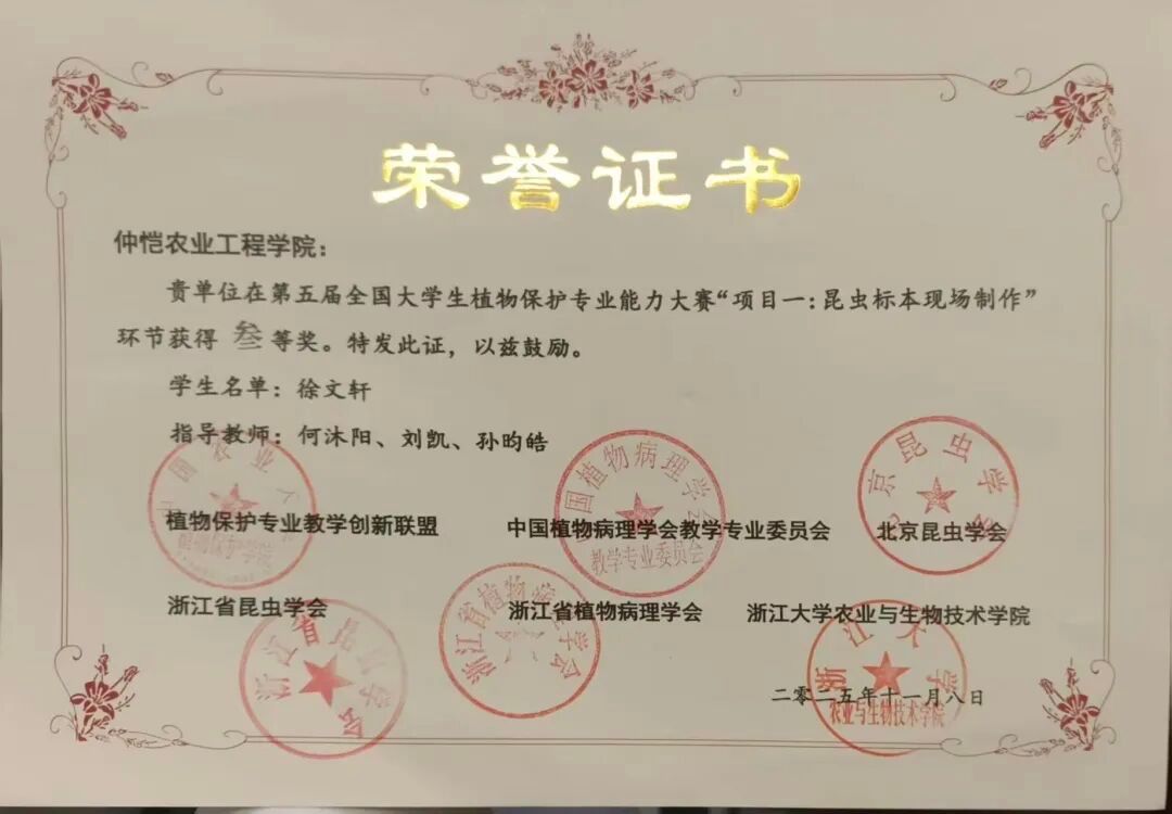 我院学子凭借扎实的专业功底、出色的实践能力和默契的团队协作,在激烈角逐中脱颖而出,徐文轩荣获“项目一:昆虫标本现场制作”环节的三等奖(指导老师:何沐阳、刘凯、孙昀皓)。