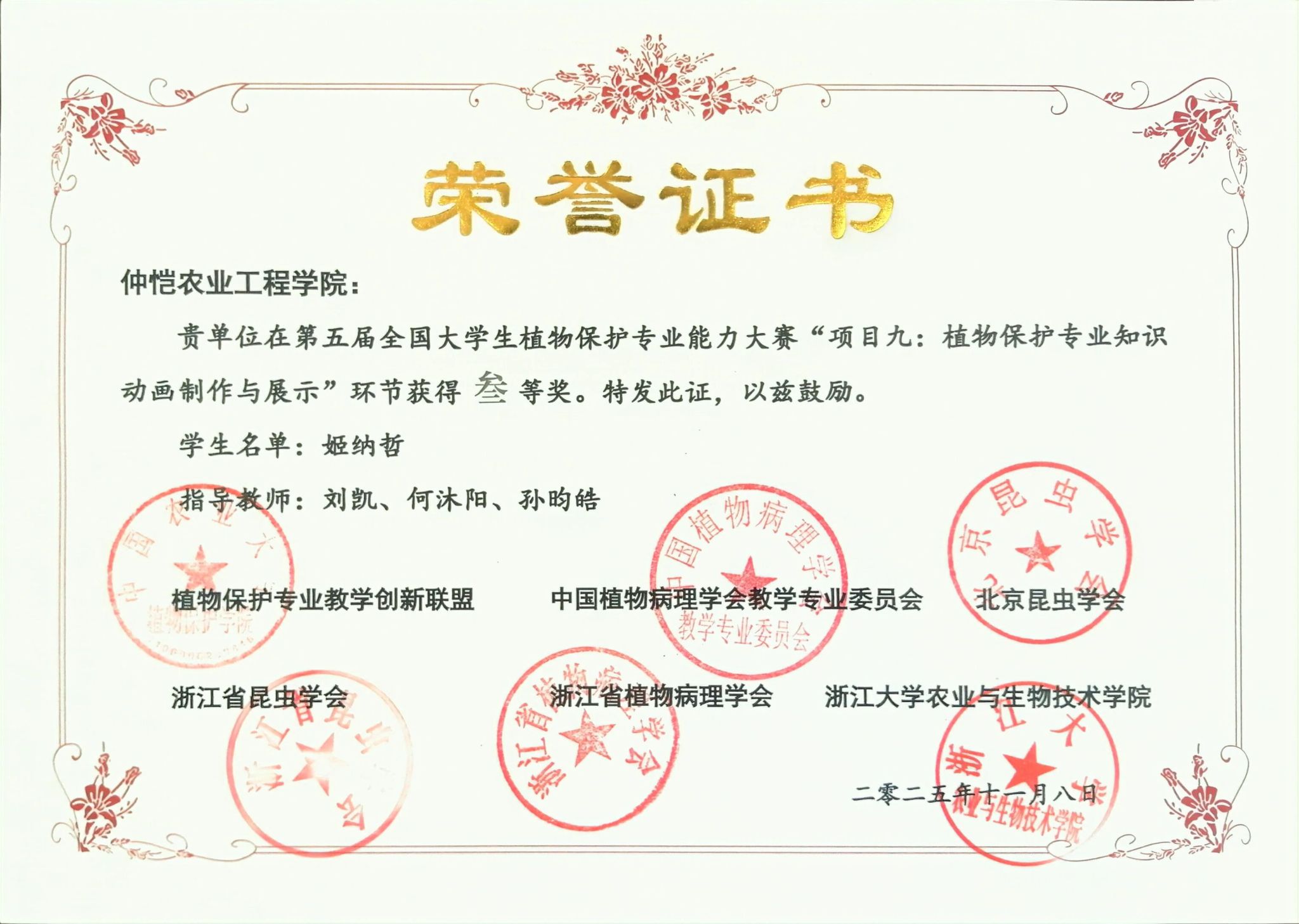 姬纳哲获得“项目九:植物保护专业知识动画制作与展示”环节的三等奖(指导老师:刘凯、何沐阳、孙昀皓)。