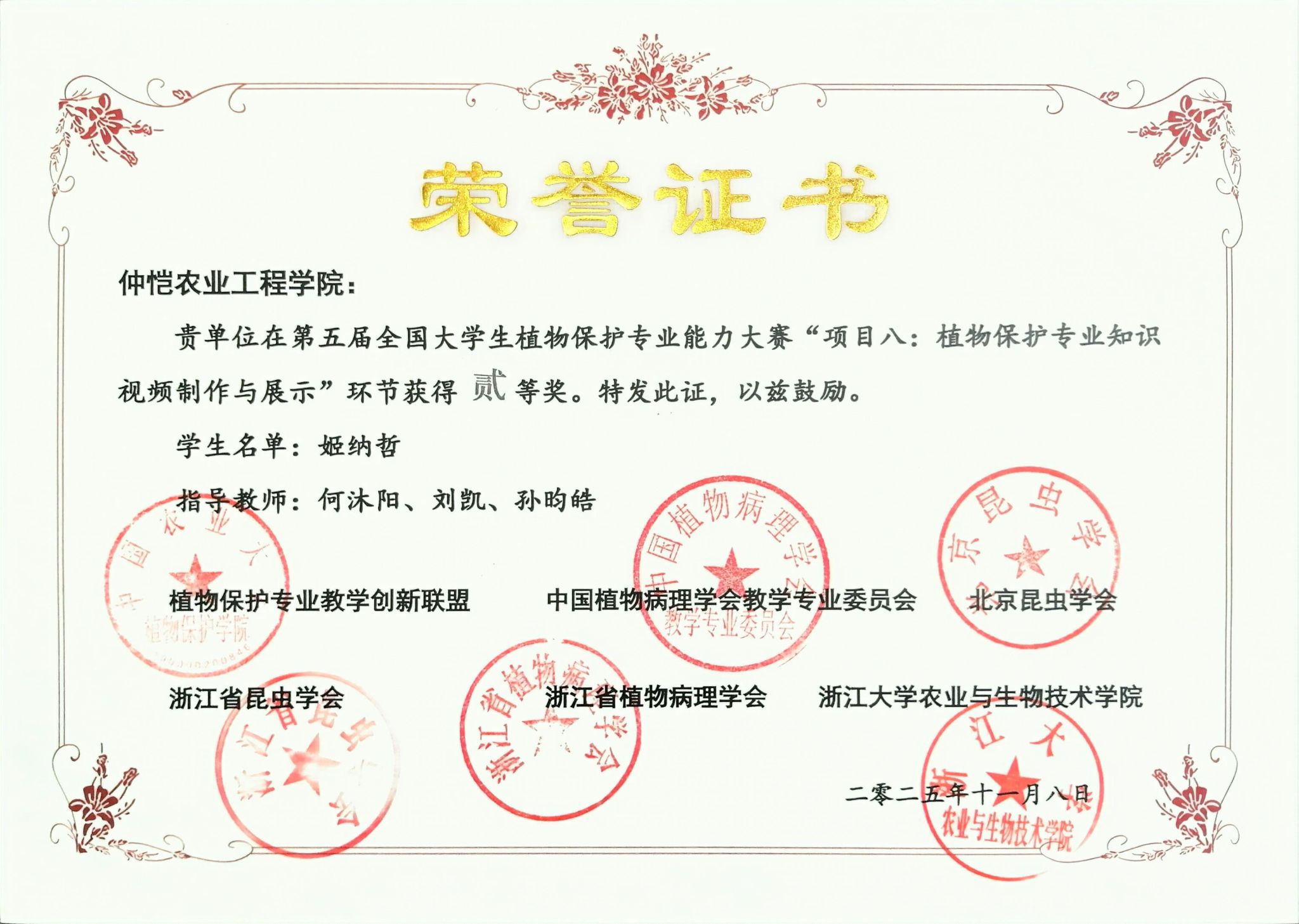 姬纳哲获得“项目八:植物保护专业知识视频制作与展示”环节的二等奖(指导老师:何沐阳、刘凯、孙昀皓)。