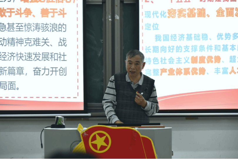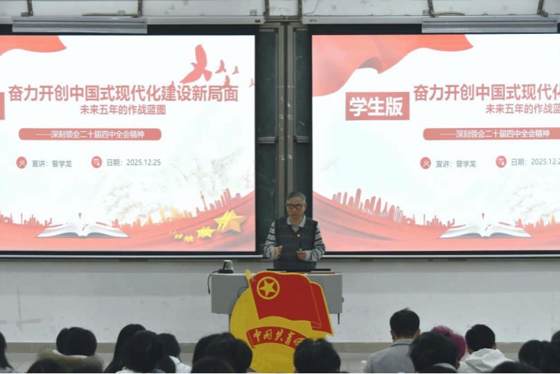 随后,校关工委常务副主任曾学龙教授以“奋力开创中国式现代化建设新局面——深刻领会二十届四中全会精神”为主题进行授课。他以“锚定‘十五五’坐标,在农科领域践行青年担当”为切入点,从党的二十届四中全会召开背景、“十五五”规划核心要义等方面展开系统解读。授课中,曾教授结合“十四五”时期我国在粮食安全、农业科技、生物制造等领域的重大成就,用详实的数据和生动的案例,让学员直观感受国家发展的强劲脉搏。