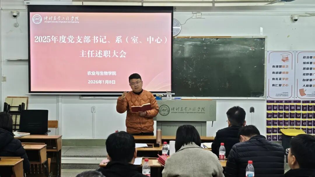 1月8日下午,农业与生物学院党委在海珠校区303教室召开2025年度党支部书记、系(室、中心)主任述职大会。学院党委书记周超雄、院长喻国辉、党委副书记张金凤、副院长徐彪、副院长齐永文,学院全体党委委员、各党支部书记和各系(室、中心)主任参会。会议由周超雄主持。