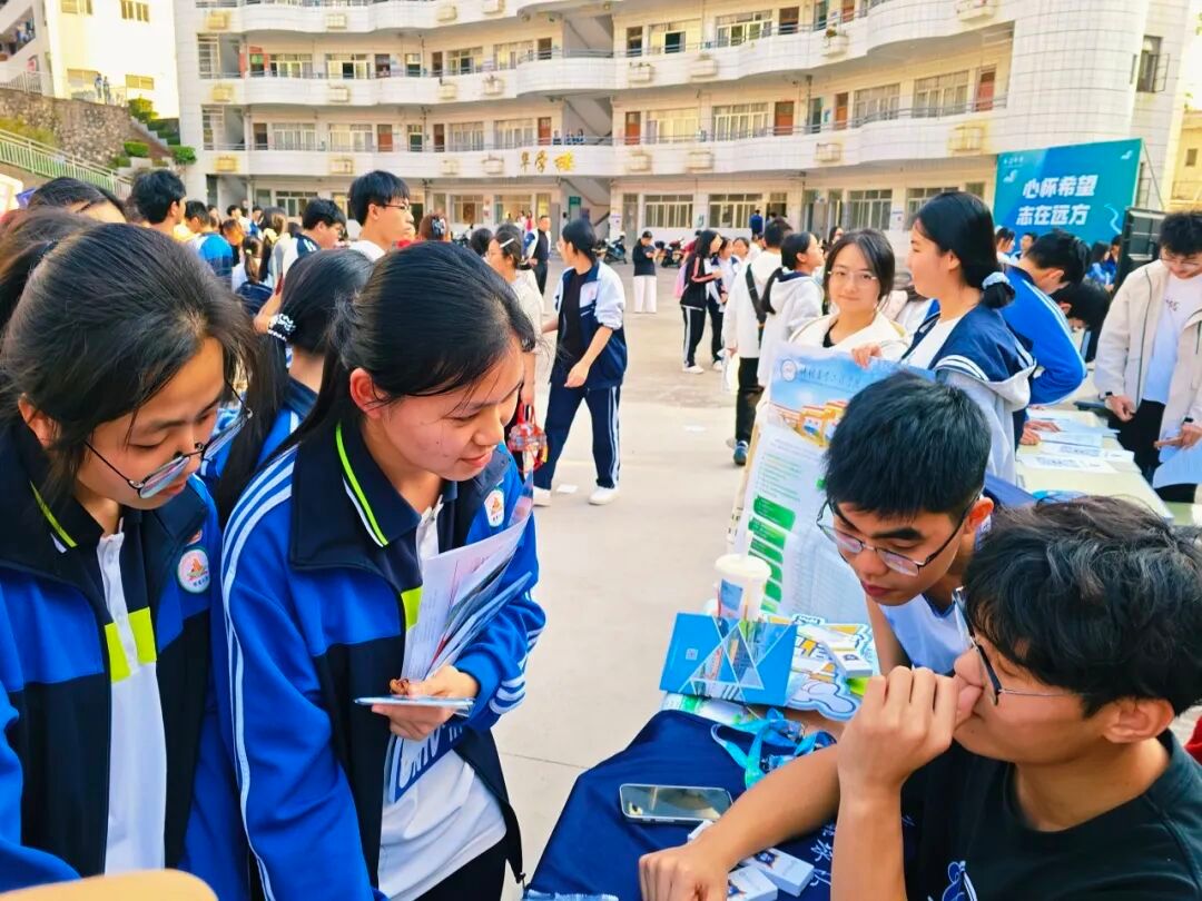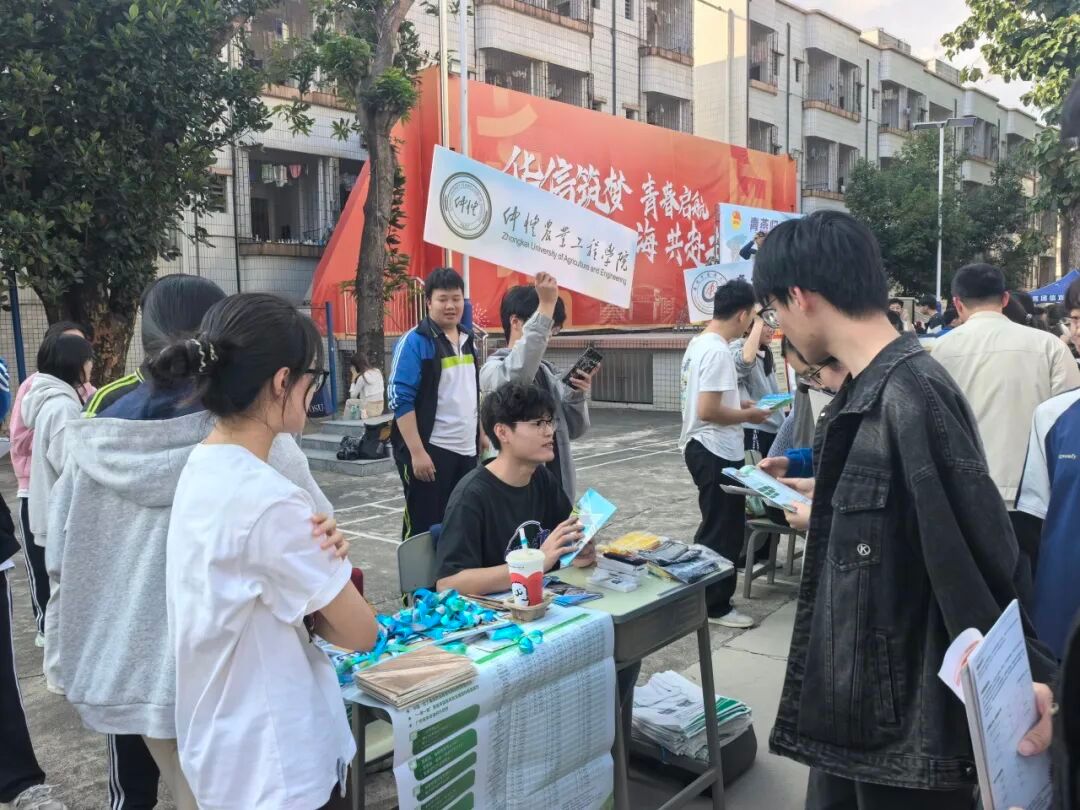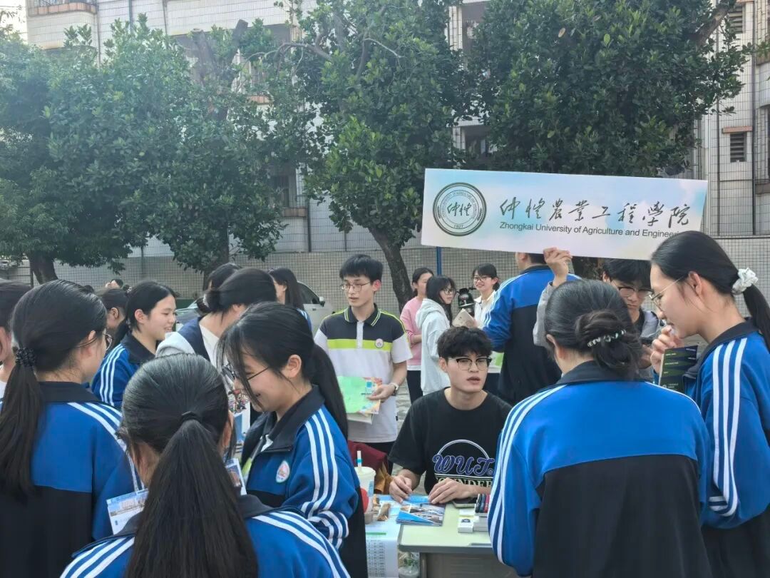 活动现场,小分队成员提前布置好宣传物料,包括学校的招生海报、宣传手册,还有仲园特色的文创礼品,吸引了大批高三学子驻足咨询。作为学校的“代言人”,小分队成员们分工协作、热情互动。通过讲解展板、分发宣传册与动态演示相结合,队员们向高三学子们系统介绍了我校的办学历史、学科优势、校区设施以及丰富的校园文化生活,生动呈现仲恺学子多元成长的路径。高三学子提问的问题涵盖历年录取分数线、优势专业推荐、校园生活条件等内容。团队成员结合学校新招生政策与在校亲身经历,耐心细致地一一解答,并帮助学弟学妹明晰目标,增强报考信心。