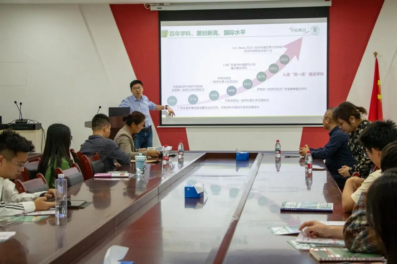 随后,华南农业大学农学院王小龙教授率先开展宣讲。他以学院百年办学底蕴为切入点,重点介绍了学院依托的国家“双一流”建设学科优势,详细解读了本-博全流程培养体系、本硕博连读政策,以及学术型硕士与专业型硕士的培养特色。此外,王小龙还分享了学院以顶尖院士为核心的师资团队、近5年研究生以第一作者发表251篇论文的学术成果、全额资助的国际交流机会,以及2025届毕业生100%就业率等核心亮点,让在场学生全面直观地了解学院实力。