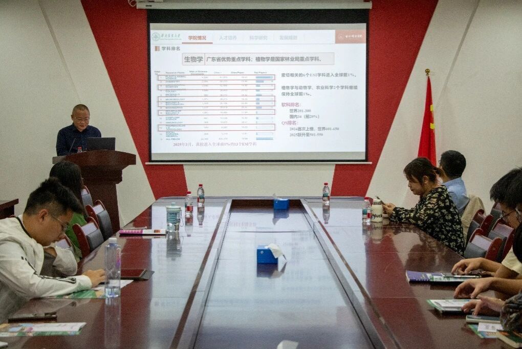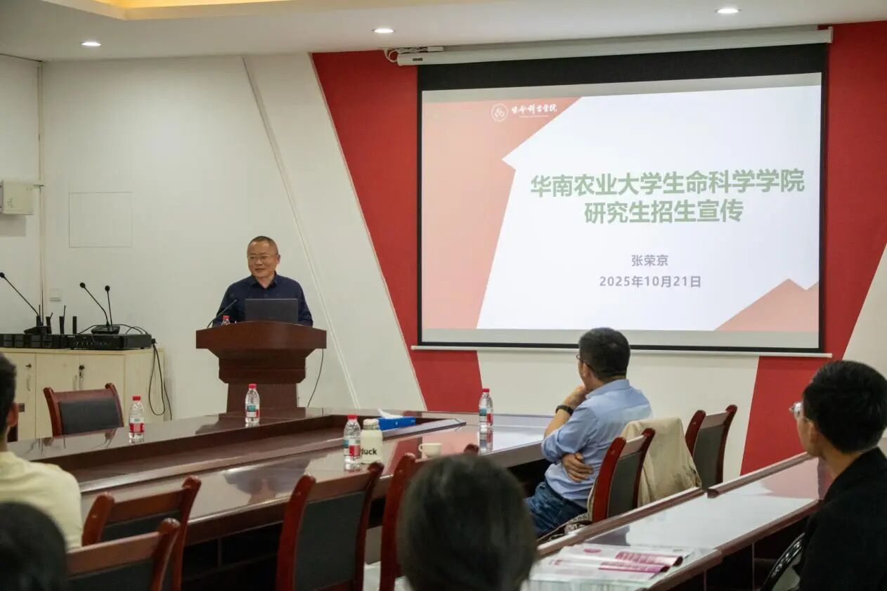 紧接着,华南农业大学生命科学学院张荣京教授聚焦学院核心优势展开介绍。他从学科布局出发,详细讲解了学院在分子生物学、微生物学等特色专业方向的研究重点,同步展示了省级重点实验室、校企联合研发中心等优质科研平台资源。在研究生培养方面,张教授重点说明“导师组负责制+科研项目实践”的培养模式,结合学生参与国家级课题、发表高水平论文的具体案例,直观呈现学院的学术实力与育人成果。最后,他分析了毕业生在科研院所、生物科技企业等领域的就业前景,为有意向报考的学生提供了清晰、实用的方向指引。