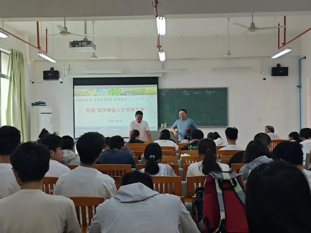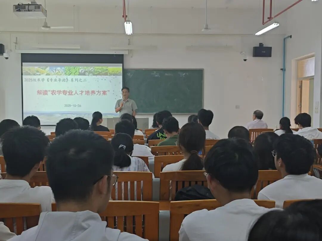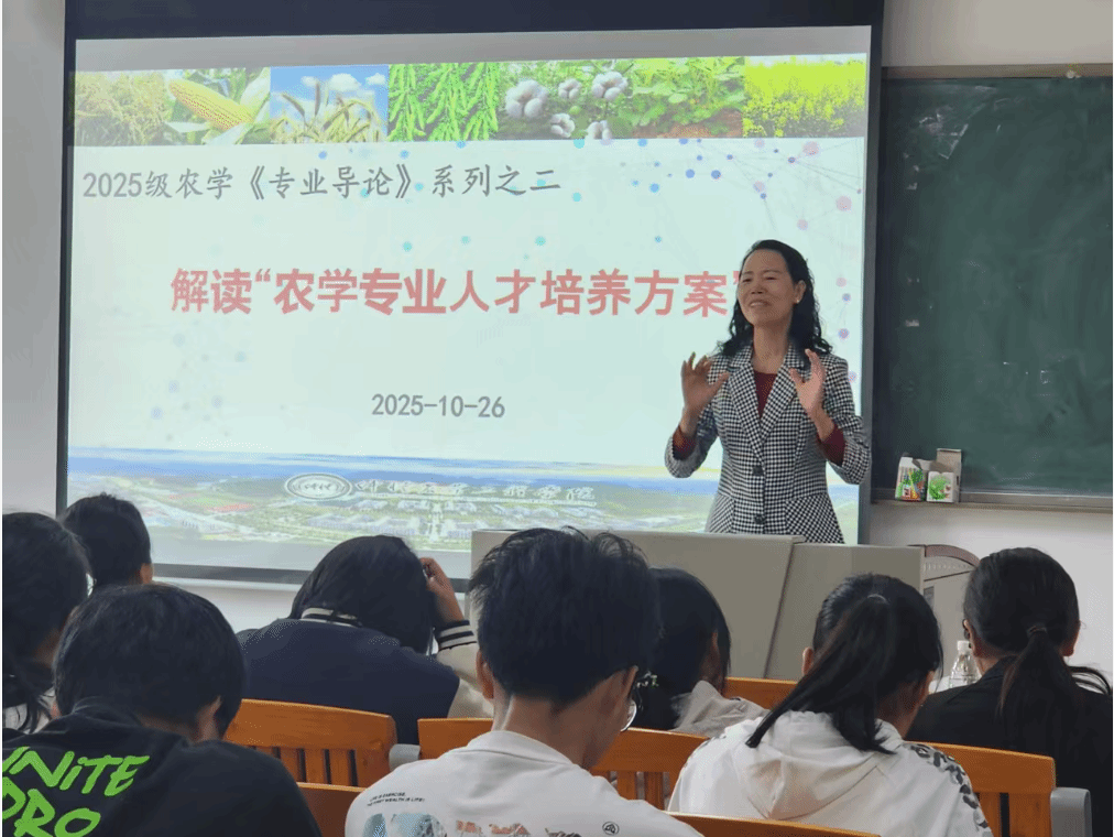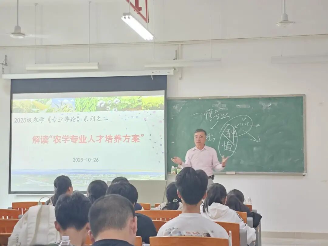 2025 年 10 月 26 日上午,农业与生物学院农学系在生命科学大楼 A 栋 507 教室,为 2025 级农学专业全体同学开展《专业导论》专题讲座。本次课程聚焦 “农学专业人才培养方案” 解读,由农学系系主任、班主任孙伟副教授主持,蒋锋副教授主讲。学院特别邀请学院党委书记周超雄、退休专家谢振文教授、赵玉环副教授,以及 2015 级优秀校友林金利返校作分享,为新生成长成才提出殷切期望。