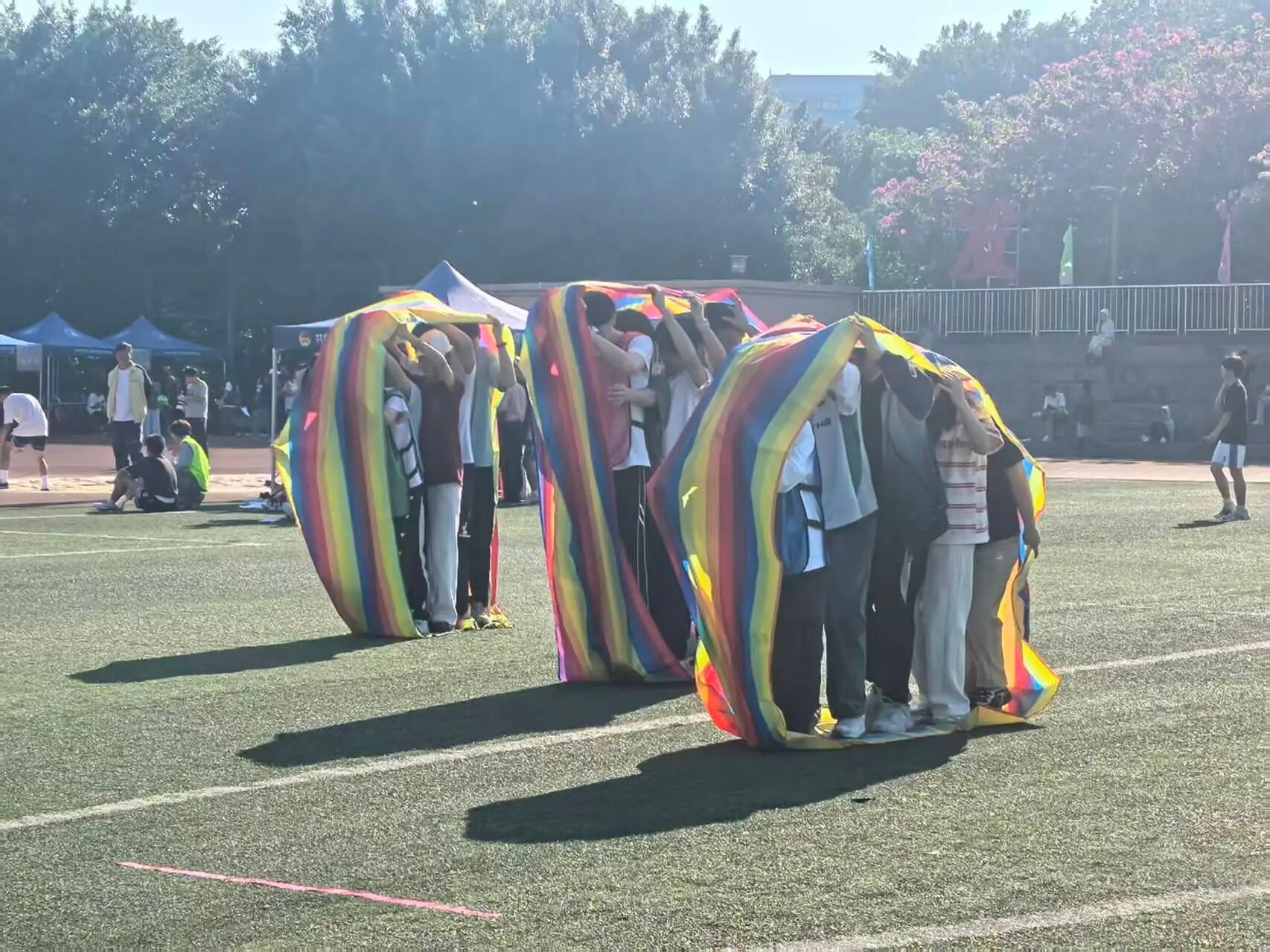 穿插在各项比赛之间的还有学生趣味运动会。在“摸石头过河”中,队员们默契配合,巧妙传递与移动河石;“扔枕头大战”现场欢笑不断,在沙包的抛掷与躲避间尽显智慧与敏捷;“盲人敲锣”项目则考验着队友间的信任与指引;而在“旱地龙舟”与“风火轮”这类集体项目中,成员之间更是将团队协作精神展现得淋漓尽致。整个趣味赛场在轻松愉快的氛围中强化了学生们的集体荣誉感与凝聚力。