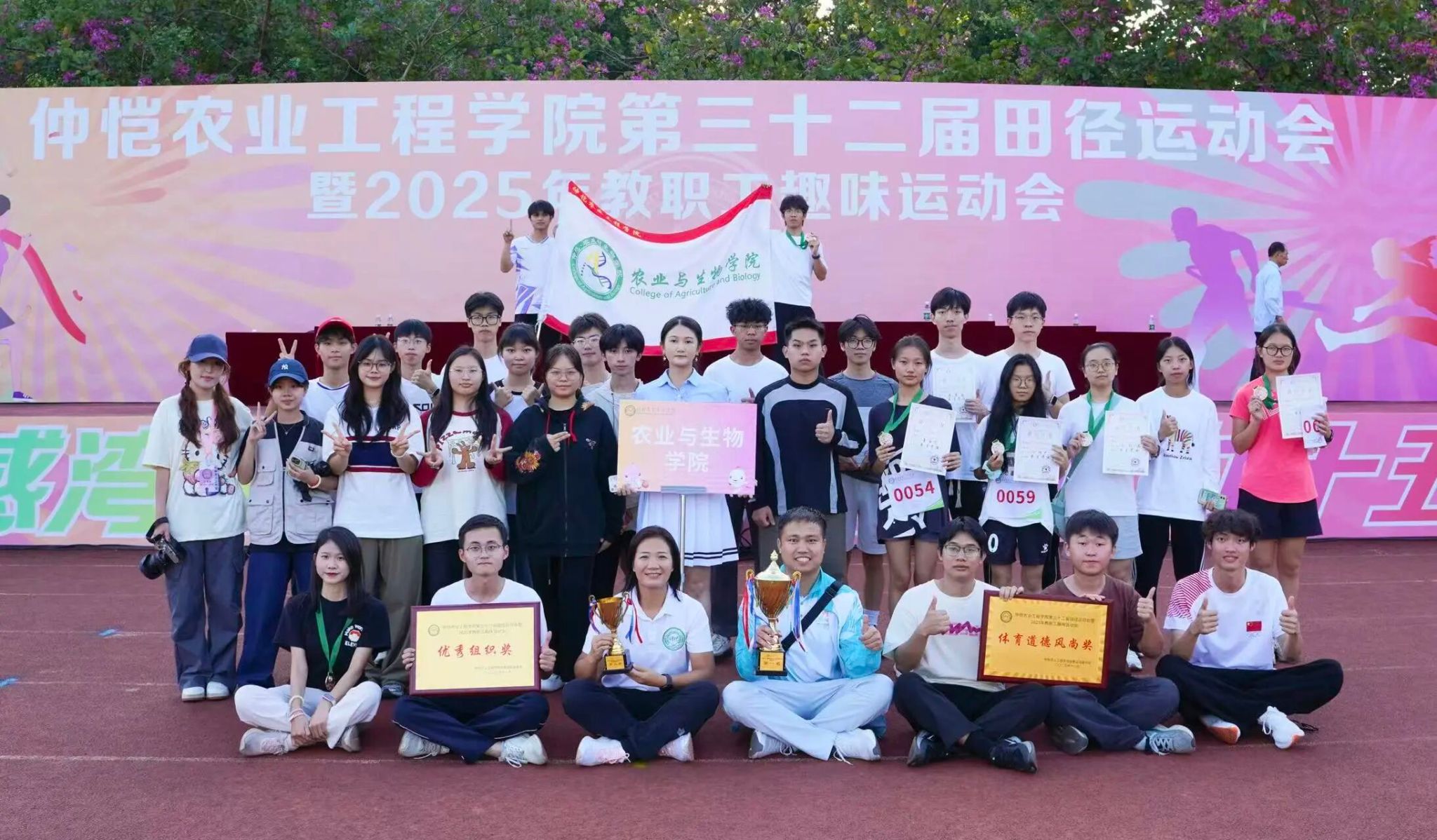 11月14日-15日,仲恺农业工程学院第三十二届田径运动会暨2025年教职工趣味运动会在白云校区运动场盛大举行。经过两天各项赛事的激烈角逐,我院师生代表队以优异成绩斩获了学生组团体总分第一名、教职工团体总分第三名、“优秀组织奖”“体育道德风尚奖”等殊荣!