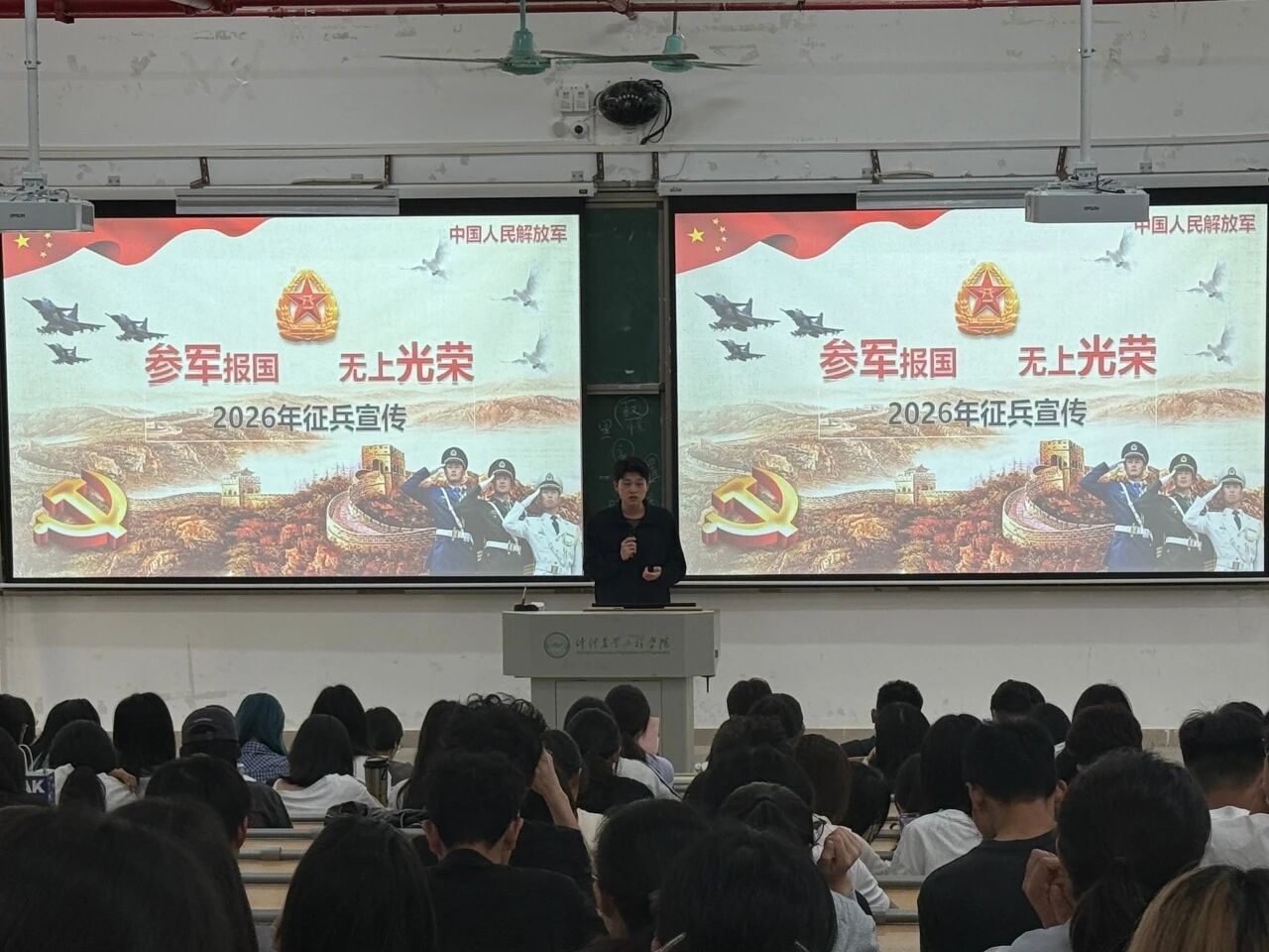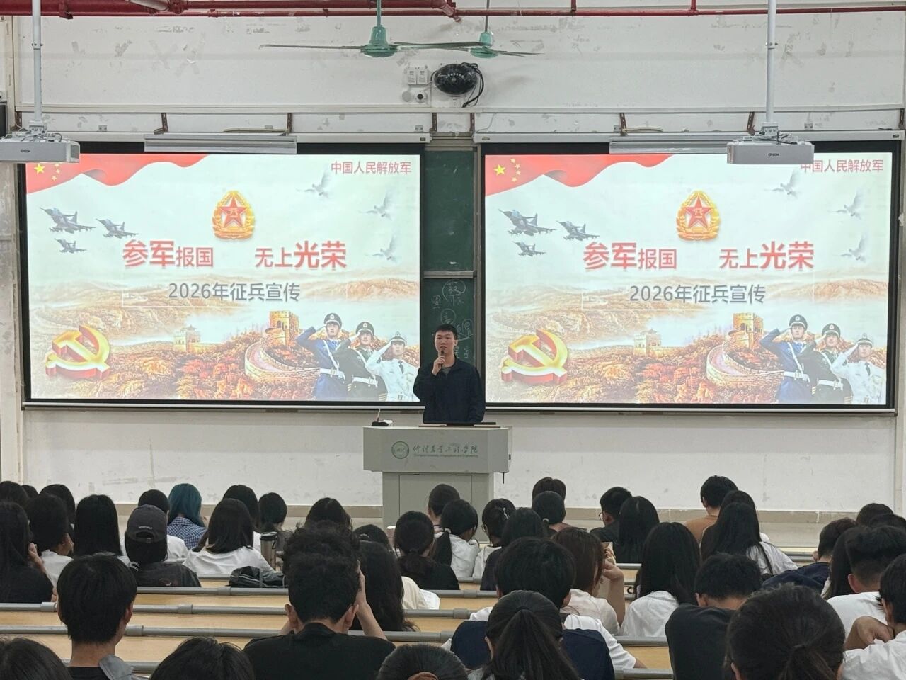 大会下半程,植保231班王亦清、生技231班吴腾威两位退伍复学同学,结合自身军旅生涯经历,为23级同学们生动分享部队的日常训练与生活点滴,讲述参军报国过程中的成长与收获。他们对2026年国家征兵政策进行详细解读,介绍参军入伍的相关补贴福利与保障政策,向全体同学发出“参军报国、无上光荣”的青春号召,鼓励大家积极投身军营,在火热的军营中淬炼意志品格、践行家国担当。