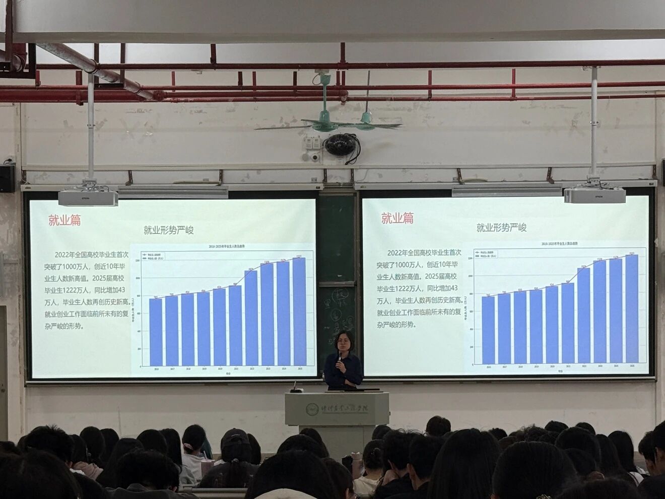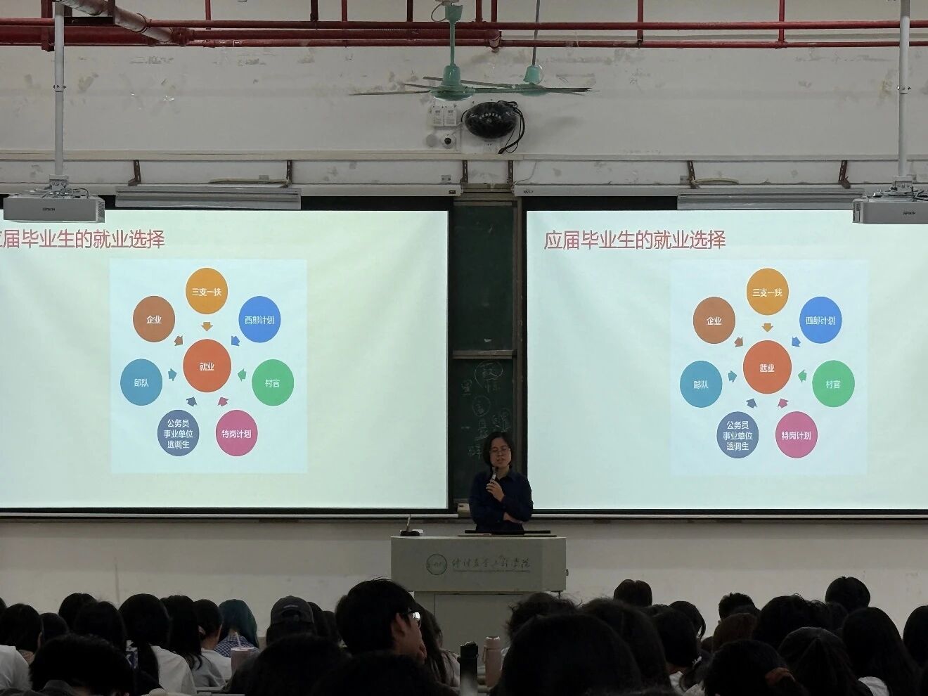 针对同学们普遍关注的就业与升学问题,孙晓芳结合学院2025届毕业生就业升学数据展开细致分析——不少学子成功升学至中山大学、华南农业大学等知名高校。她结合当前严峻的高校毕业生就业形势给出务实发展建议,鼓励同学们扎实筑牢专业基础、全面提升综合素养、积极拓宽就业渠道。同时,孙老师围绕考研适配性、备考动机、院校专业选择及各阶段备考规划展开系统性指导,助力同学们科学规划、稳步前行。