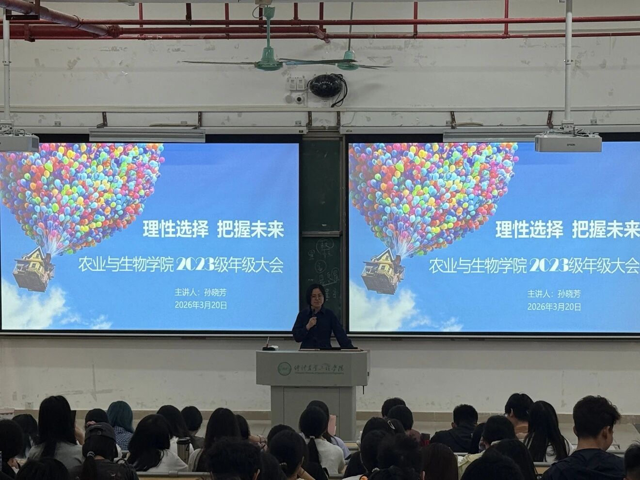 为引导2023级学子明晰学业发展方向、科学规划未来道路,进一步强化安全防范意识与责任担当,3月20日上午,农业与生物学院在白云校区D2小礼堂召开2023级年级大会。参加本次大会的有农业与生物学院辅导员孙晓芳以及全体23级学生。大会由孙晓芳主持。